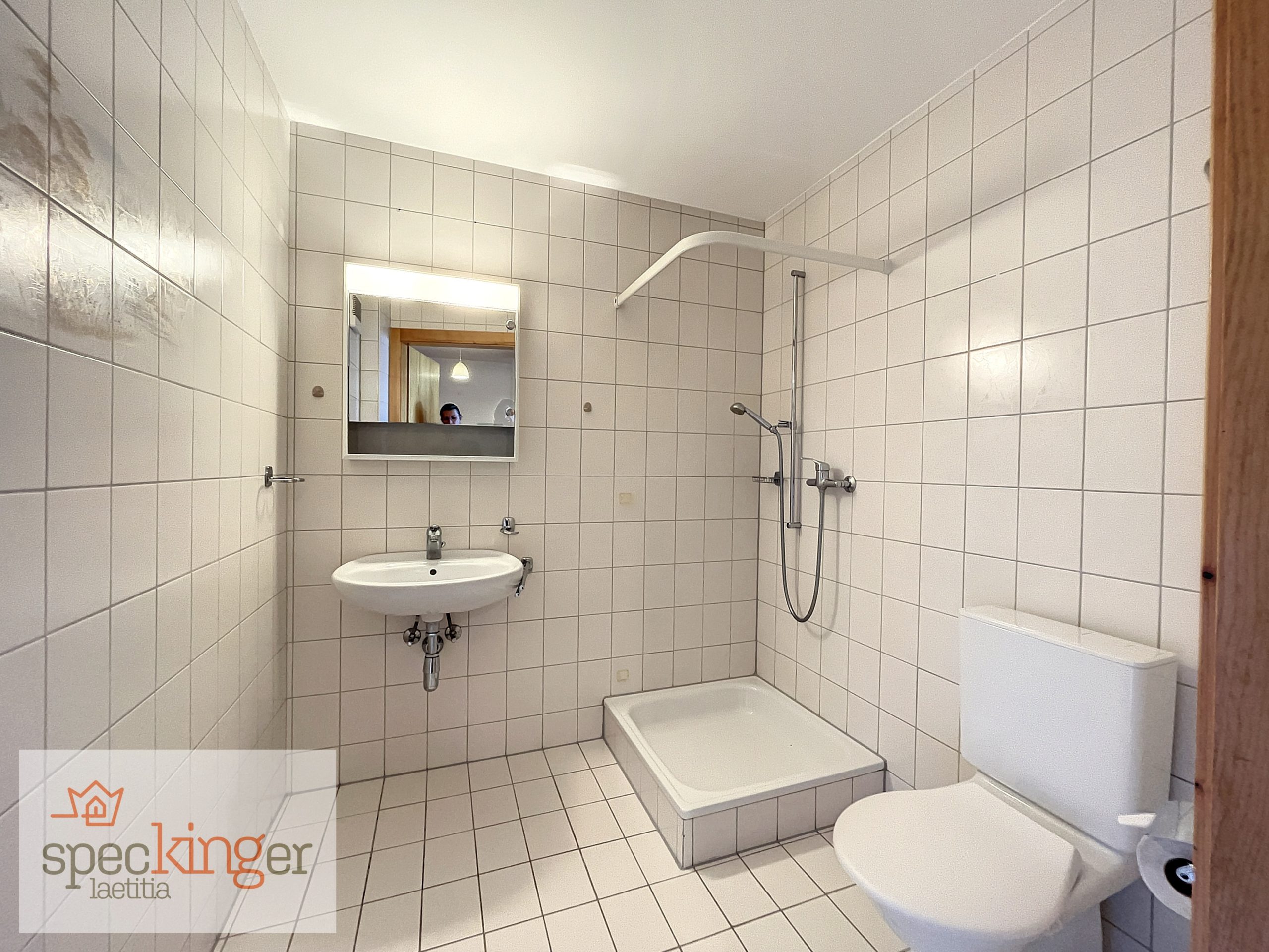 La chambre est spacieuse et la salle de douche/WC permet d’installer un peu de rangement.