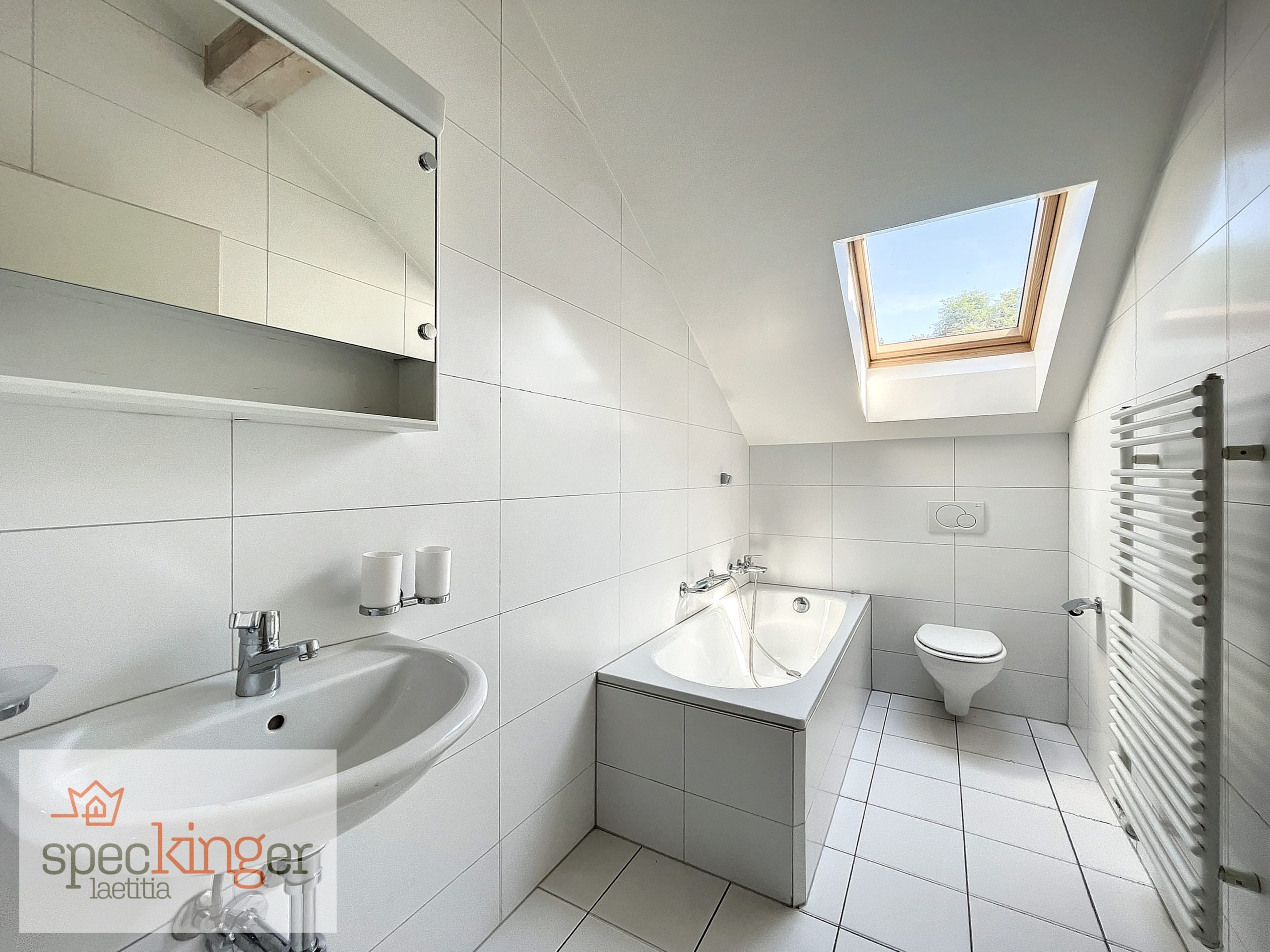 La salle-de-bains est bien entendu séparée de la pièce principale et dispose d’une baignoire, d’un lavabo, d’un WC, d’un sèche-serviette et d’un velux pour profitez de la lumière du jour.