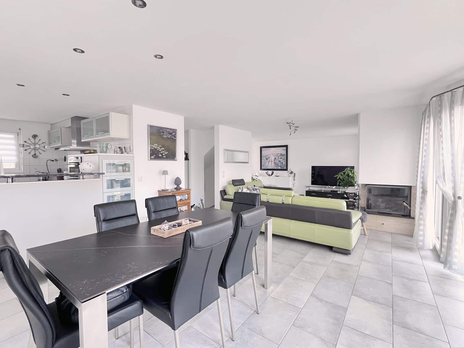 Le premier étage s’ouvre sur un vaste plateau de 81m2 baigné de lumière composé d’un grand séjour avec cheminée, une salle-à-manger séparée par un bar de la cuisine généreusement équipée et aménagée.