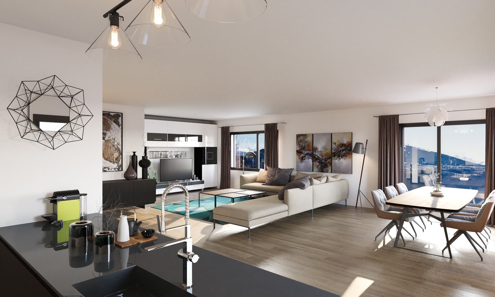 Profitez d’un séjour spacieux, avec une cuisine ouverte et une fenêtre d’angle offrant une vue magnifique sur la vallée.